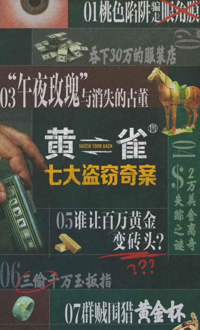 总共描述了黄雀 7 一个大案例,分别是桃色陷阱骗光角膜案例,30 服装店消失案1万元,“午夜玫瑰”和消失古董2000元, 万美元离奇失踪案,百万黄金变砖,三偷千万玉扳指,群贼围猎金杯。