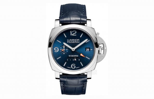 手表评价:沛纳海庐米诺系列 44 mm动储两地时自动上链手表(型号:PAM1482),是沛纳海在精确记时、两地时、高复杂功能领域的真诚之作。44 Mm抛光精刚枕形表壳,配以蓝色太阳放射纹三明治表盘,涂白色 Super-LumiNova ® 夜光镀层,配有庐米诺系列标志性的护桥设备。秒针表盘配置秒针归零设备,拔出表自动重置时秒针,轻松实现精确时间同步设置。搭载 P.2003 配有惯性调节器的自动上链机械机芯,无卡度摆陀,振动频率达到一小时 28800 第二,安装三个发条盒,通过透背设计,可以仔细欣赏精密复杂的机芯和内部细节。两个地方的功能都是10天比较长的动储技术,同时还配有线性动储显示, 100 大米防水功能,算是突破了手表的性能界限,在沛纳海庐米诺系列的意式风格中真诚地呈现在眼前。另外还配有深蓝色鳄鱼皮表带和同色橡胶表带,兼具休闲质感和运动气质,突出自由练习的卓越风范。