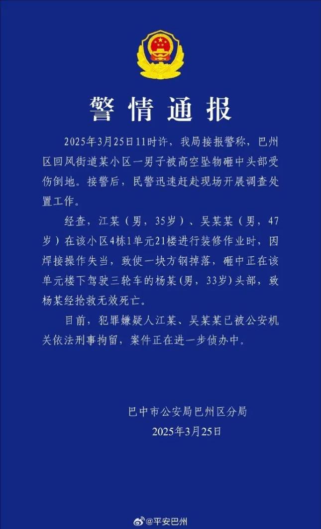 2025年3月25日11时许,我局接到报警称,一名男子在巴州区回风街道某小区被高空抛物砸中头部,摔倒。警方接到报警后,迅速赶到现场进行调查处置。