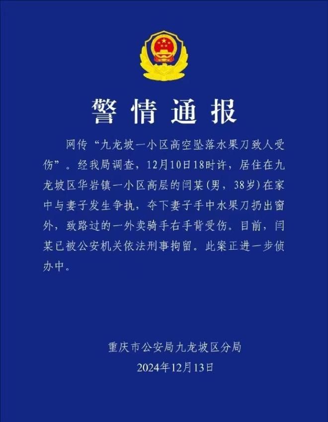 2024年12月10日18时许,重庆某小区高层居民闫某(男,38岁)在家与妻子发生矛盾,将妻子手中的果刀从窗外拿下,导致一名路过的外卖骑手右手背受伤。随后,闫某被公安机关依法刑事拘留。