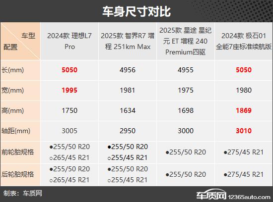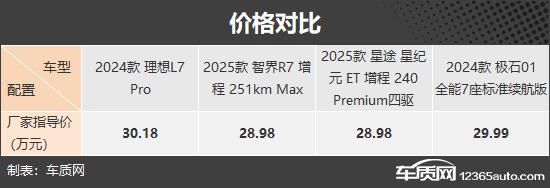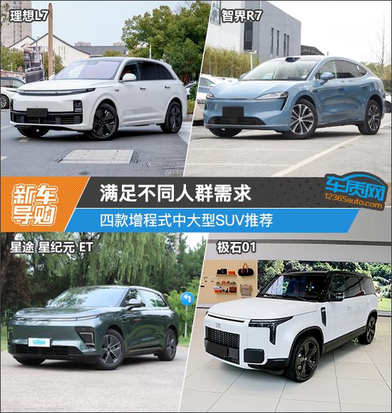 今日为大家推荐四款增程式中大型增程式。 SUV,分别是理想 L7、智界 R7 增程(以下简称:智界 R7)、星途星纪元 ET 增程(以下简称:星纪元 ET)以及极石 01。其中,理想 L7 想必大家最熟悉,市场表现出色;智界 R7 去年出版了这个版本 12 月刚上市,采用轿跑设计,综合续航可达。 1570km;星纪元 ET 然后凭借出色的性价比,获得了极大的关注;而且极石 01 也许每个人都比较陌生,这是一家人。 2021 年才创立的汽车品牌,但是说到极石汽车的创始人昌敬,相信有些朋友应该听说过。他的另一个身份是石材科技的创始人,现在已经成为国内扫地机器人市场的头部品牌。四款车都是自有品牌,市场定位会有所不同,可以满足不同人群的购车需求。
