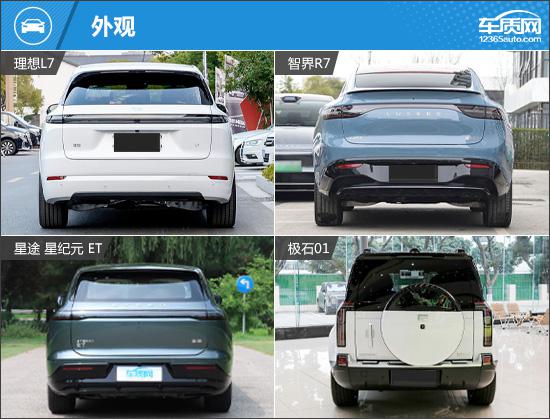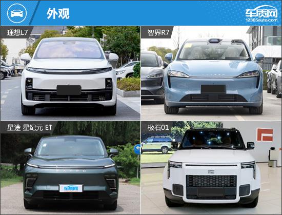 在外观上,四款车都采用了各自的家族式设计语言,其中理想 L7、智界 R7 和星纪元 ET 前格栅全部采用封闭式设计,并配有贯穿式日间行车灯和尾灯,点亮后非常有前途。极石 01 正面采用传统的前格栅,整体设计也要更加硬核,非常有气场。值得注意的是,智界 R7 在四款车中,轿跑车是唯一的选择。 SUV 风格型号,整个侧面纤细动感,更容易吸引年轻消费者。