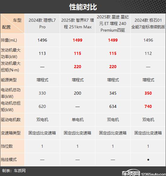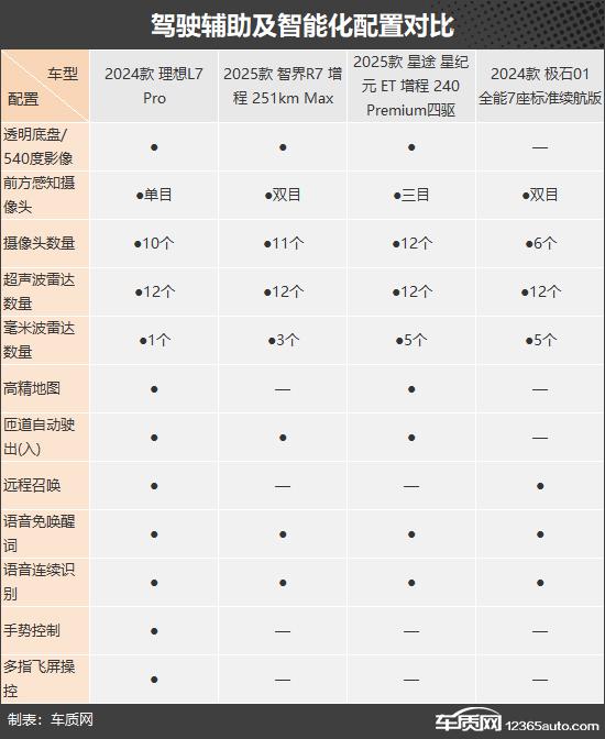 可以看到,这次推荐的四款增程式中的大型 SUV 都有不错的表现,尤其是理想。 L7、智界 R7 和星纪元 ET,就配置水平和智能表现而言,旗鼓相当。如果是年轻消费者,追求时尚的外观和智能的表现,可以专注于智慧世界 R7;假如主要用于家庭旅行,理想 L7 和星纪元 ET 那就更适合你了。相比之下,极石 01 配置性能略逊一筹,但在性能方面具有一定的优势,而且还可以选择安装一些原厂户外设备,更适合喜欢自驾游的消费者。