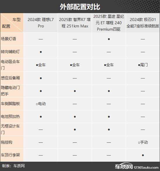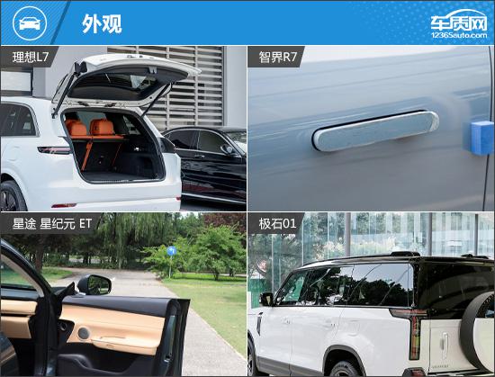 理想的外部配置 L7 性能最好,不仅专属于转向辅助灯和感应后备箱,也是四款车中唯一可选的电瓶车侧脚踏板车型,可以有效提升日常车辆的便利性。相比之下,极石 01 外部设备略有不足,但幸运的是,它占据了屋顶行李架,还可以安装手动拖钩,可以很好地满足年轻消费者的户外旅行需求。