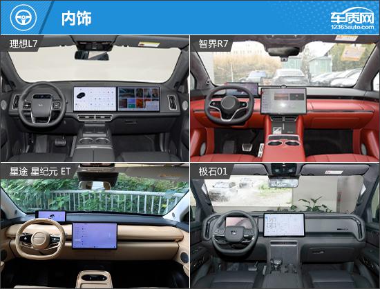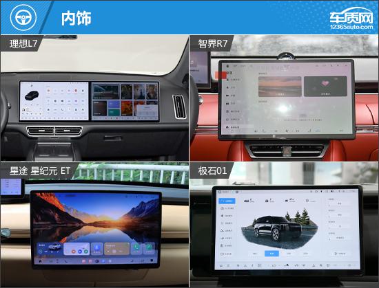 在内饰方面,四款车都采用了简约的设计风格,车内的大部分功能都集成在中控屏内。其中,理想 L7 独占副驾驶娱乐屏,让整个内饰看起来更有科技感。智界 R7 和星纪元 ET 方向盘形状最为独特,均采用椭圆形设计。极石 01 内饰设计比较常规,但材料考究,大型软质材料的加入营造出极佳的质感。