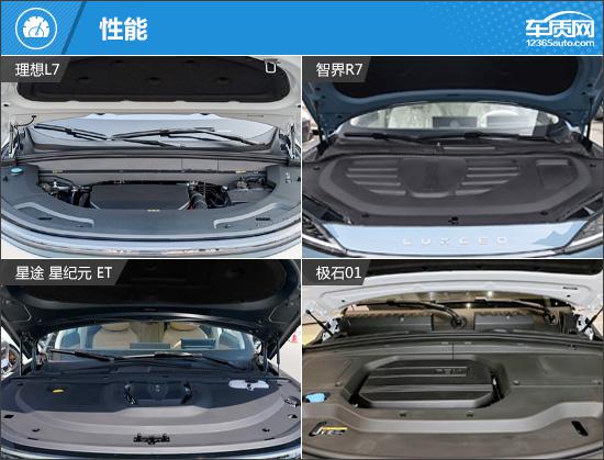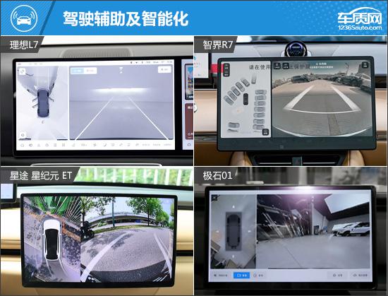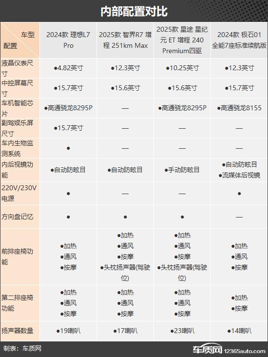 内部配置,理想 L7、智界 R7 和星纪元 ET 表现相当,保持了较高的水平。相比之下,极石 01 舒适性配置方面略有不足,例如第二排座椅没有配备通风功能,也是本次推荐车型中唯一没有配备方向盘记忆的车型。