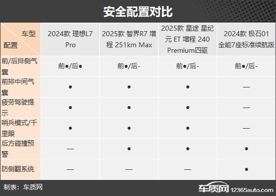 在安全性方面,理想 L7、智界 R7 和星纪元 ET 性能各有千秋,没有一款车型能占据绝对优势,都保持了较高的水平。而且极石 01 性能稍显不足,但好在独占了防侧翻系统,能有效降低越野时侧翻的风险。