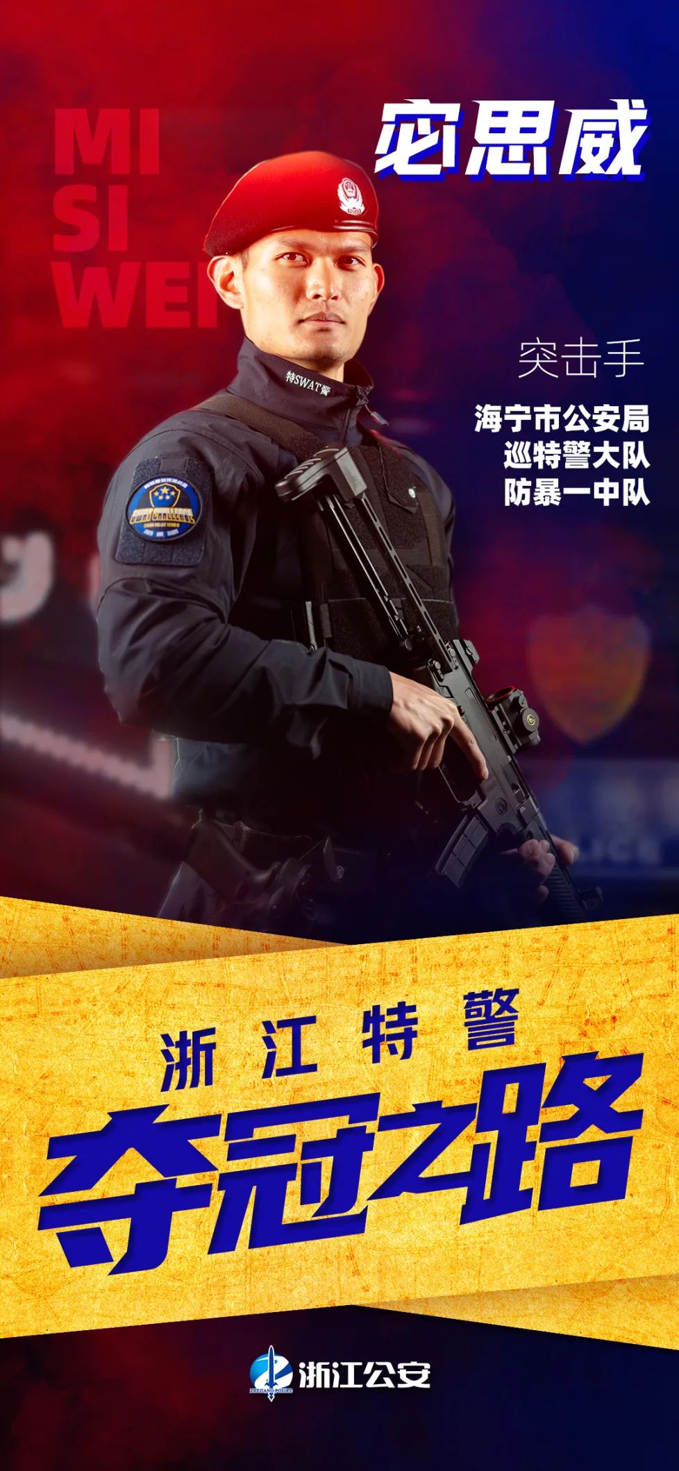 在第六届阿联酋特警比赛中,中国特警B队(浙江特警)获得冠军,所有看过比赛视频的人都被这些人枪合一的特警小伙所折服。在9名选手中,海宁特警邈思威的枪法越来越长。他在整个比赛中涉及的枪械类型最多,枪击任务最复杂、最艰巨。