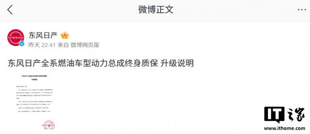 IT 世家 3 月 27 日消息,东风日产官方微博昨晚发布升级声明,宣布对东风日产所有燃油车型动力总成进行终身质保升级。