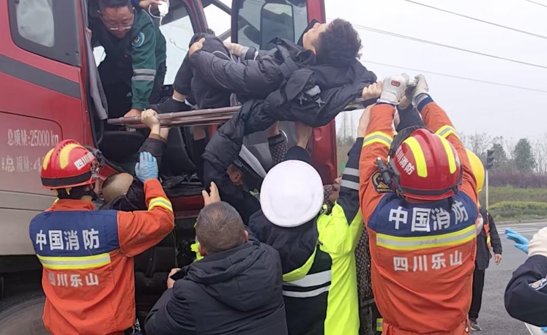 05时35分,仁寿县宝飞镇红星路南延线发生两辆货车追尾交通事故,后车司机被困驾驶室。眉山大队消防救援人员到达现场后,被困司机意识清醒,没有生命危险。