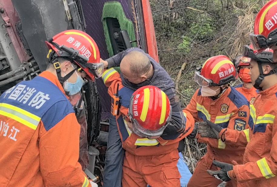 三月十七日十六时许,成渝高速内江经开区出口处,一辆轻型卡车在坡道入口处翻车,导致一名男子被困。