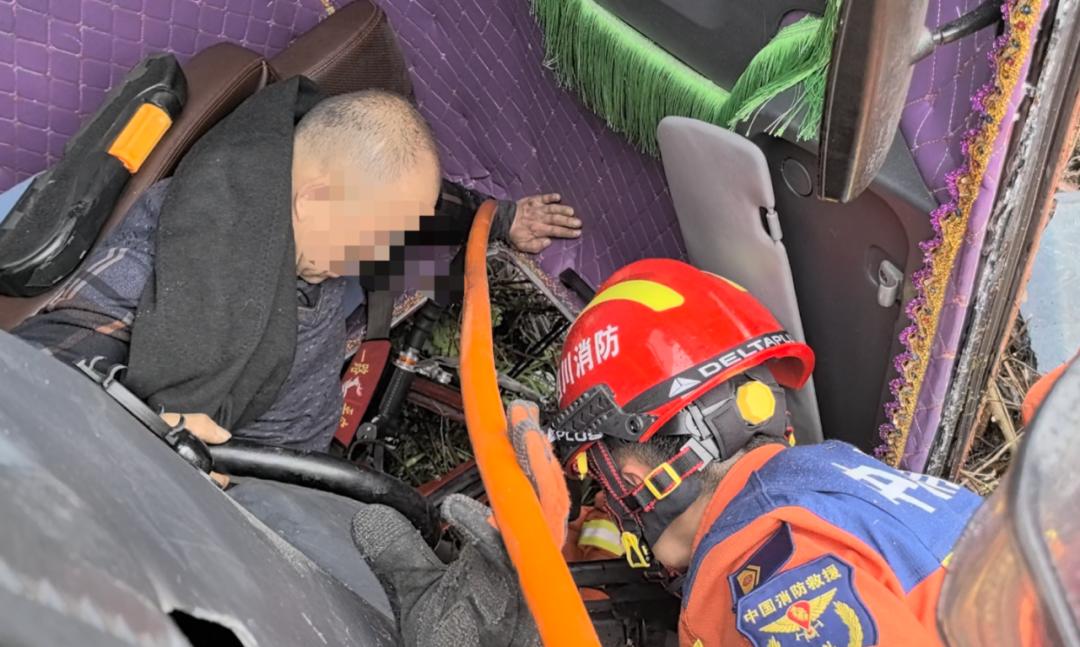 17时39分,被困司机成功救出并移交医护人员,经检查生命体征稳定。据被困司机介绍,由于雨天路面光滑,汽车在转弯时不小心翻车。