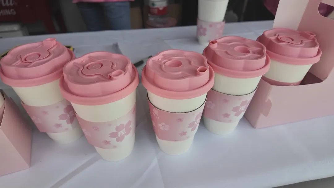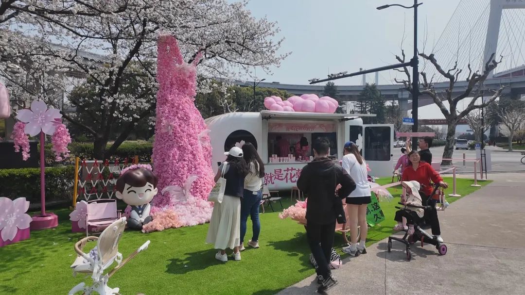 为使市民有更丰富的赏花感,现场还特别打造了精美的樱花布景。深粉色调的主题艺术装置与许多经过改造的花车相辅相成,成为市民和游客拍照打卡的热门场所。其中一辆花车被巧妙地打造成巴士餐车,提供樱花系列咖啡,泡水。无论是樱花装饰的外观,还是独特的饮料味道,都给人们带来了视觉和味蕾的多重享受。还有一辆花车被打造成一个充满公交文化的文化创意市场,印有公交元素樱花杯、精致的公交车模型、可爱的樱花造型勋章、贴纸、枕头等各种文化创意产品,让人感到兴奋。