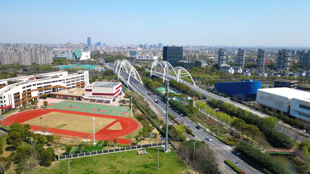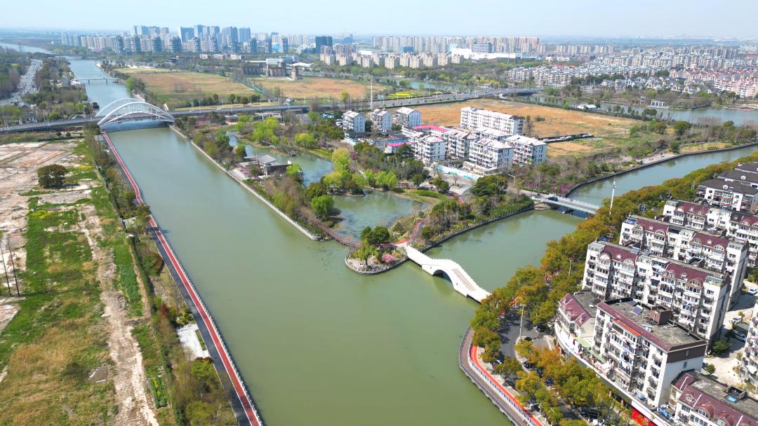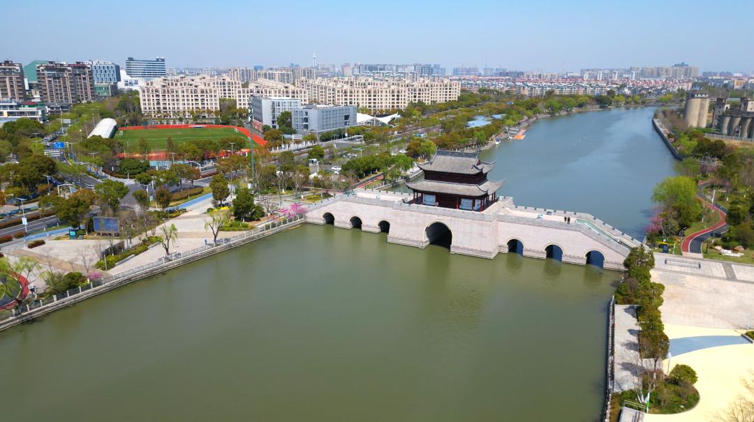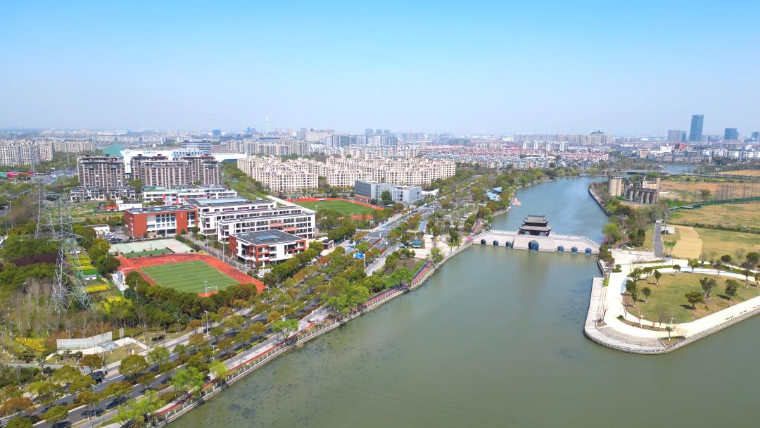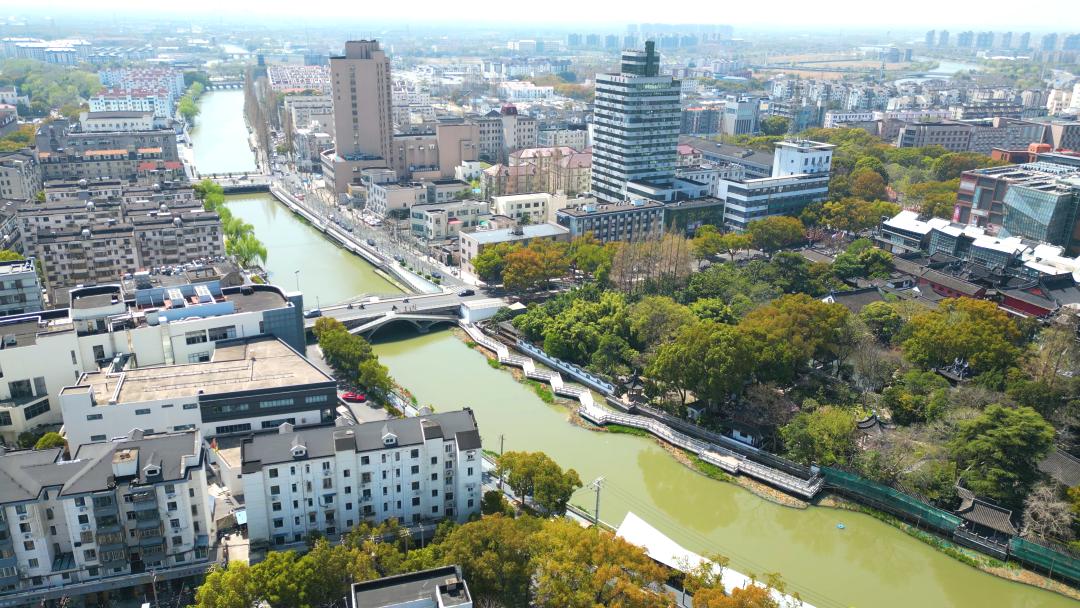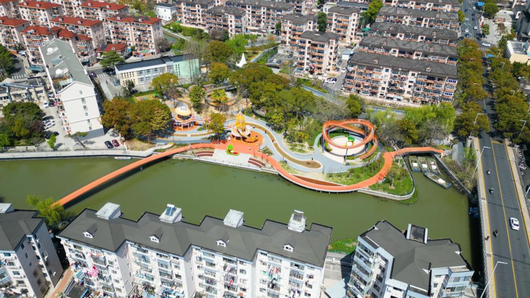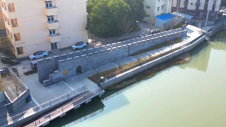 无人机在地板上飞行,重建的明代城墙砖缝间伸出一点绿色,青砖灰瓦与特写垂柳形成色彩碰撞。不远处,在更新改造的儿童公园里,彩虹般的空中栈道横跨空中,孩子们的笑声透过镜头为古老的街道注入了生动的活力,这是盈浦街道通过老城区改造项目重生的缩影。