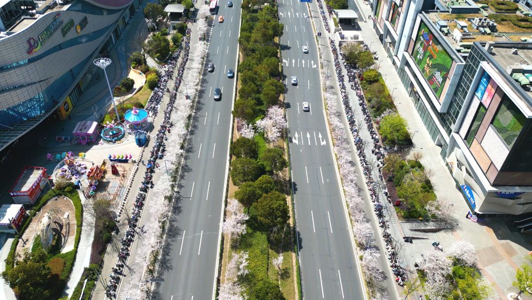转眼间,淀山湖大路万达茂附近的樱花大道跳进了镜头。两排樱花树像白丝带一样铺在路上,粉色和白色的花瓣围成一团,在微风中轻轻摇曳。路过的市民放慢了脚步,用镜头抓住了这片绚丽的花海。