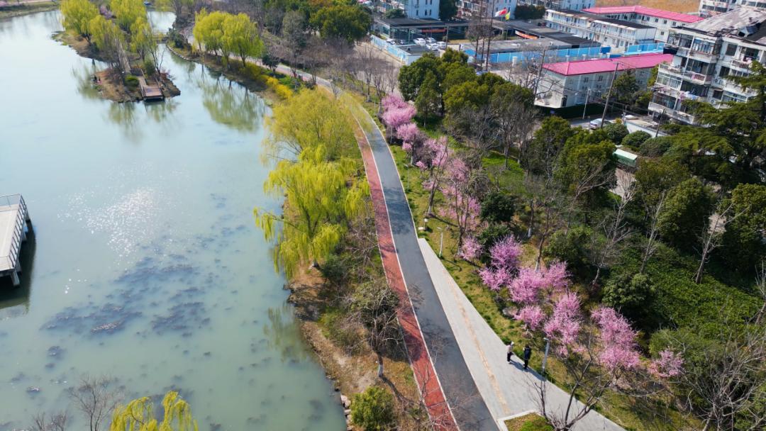 在环城水系公园,在低空飞行的无人机镜头中,嫩芽和枝叶在树枝上重叠,被生机勃勃的绿色森林和大海包围着。水城门横跨两岸,屋檐的翘曲与波光粼粼的河流相得益彰。阳光透过云层,光点在花海和绿色植物之间跳跃,为画面涂上温暖的金边。
