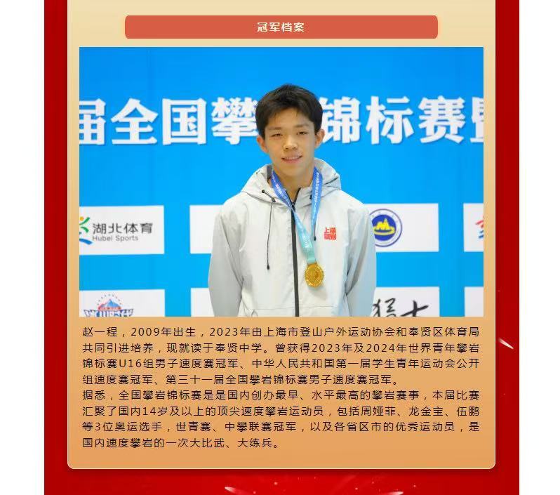 根据国际攀岩联合会的规定,参加世界杯等国际比赛的17岁选手只能在比赛年度内参加。有39名男性和28名适龄选手参加了这次选拔;另外两名17岁以下的男性和女性参加了比赛,但不管排名如何,赵一程都在这里。他出生于2009年6月,截至去年,他的最佳个人成绩为4秒93。