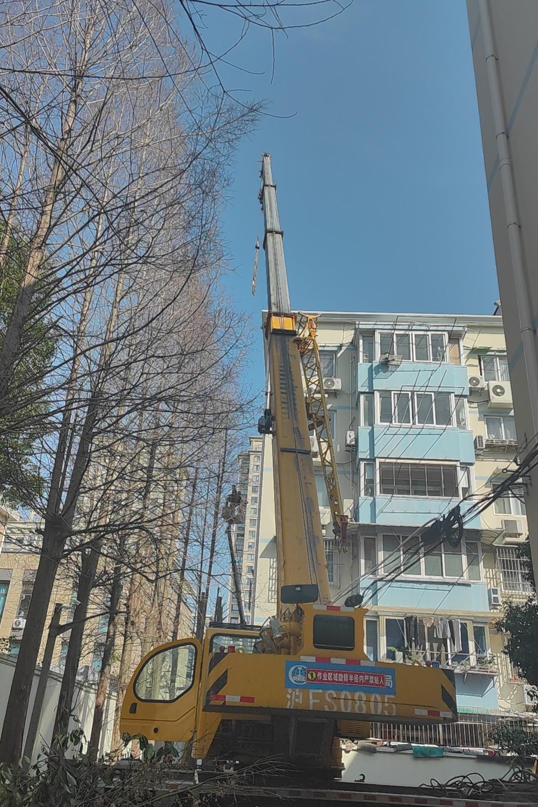 在整个维修过程中,专业修剪师紧张细致地为树木“剪头发”,居委会、行业委员会、物业“三驾马车”也齐头并进——他们引导车辆,提醒居民避让,甚至根据粗细分类堆积剪下的树枝,方便后续清运。