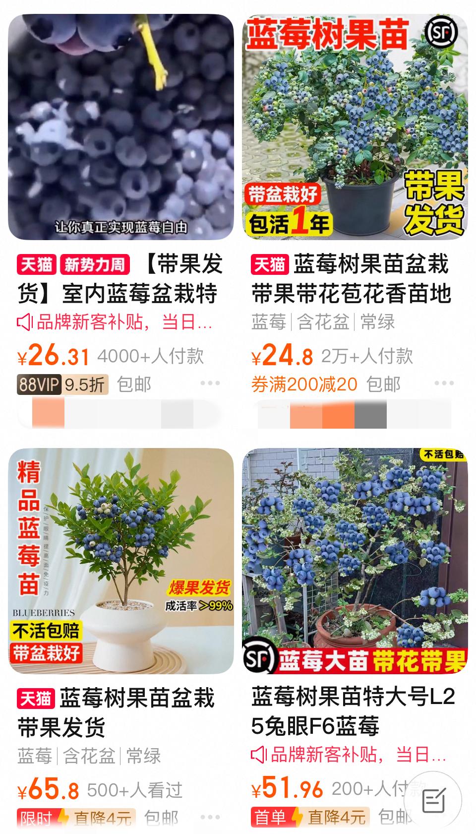 春季是播种的季节。今年春天,蓝莓盆栽也火了。据潮新闻报道,在电商平台上,近日,不少蓝莓盆栽商家迎来了爆款订单,成交量同比飙升246%。3月份,他们卖出了100多万盆栽蓝莓,最高一天卖出了8万个订单。一些云南商家每天爆款订单超过4000个,直接卖空了整个蓝莓园。从价格上看,一株蓝莓盆栽的价格在30-60元之间波动。根据后台数据,这些订单的消费者中,有一半以上是25-35岁的人,很多人已经购买了适合家庭种植的水果和蔬菜,如盆栽西红柿、阳台辣椒和客厅柠檬树。