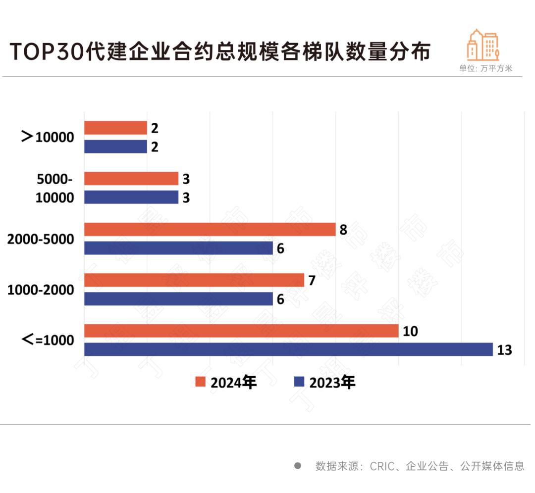 值得注意的是,部分代建企业实现梯队跃升,总合同规模在2000-5000万平方米之间,1000-2000万平方米之间的企业数量均有所增加,每个企业增加2家,1家至8家,7家。