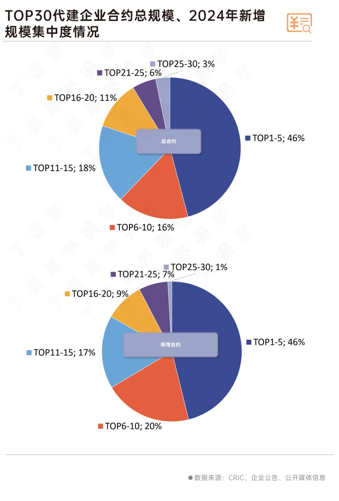 根据CRIC发布的《2024年中国房地产企业代建综合能力TOP30》名单,2024年TOP30代建公司总合同面积达9.14亿平方米,同比增长23%;新签约面积1.93亿平方米,同比增长6%,其中TOP5公司集中度接近50%。