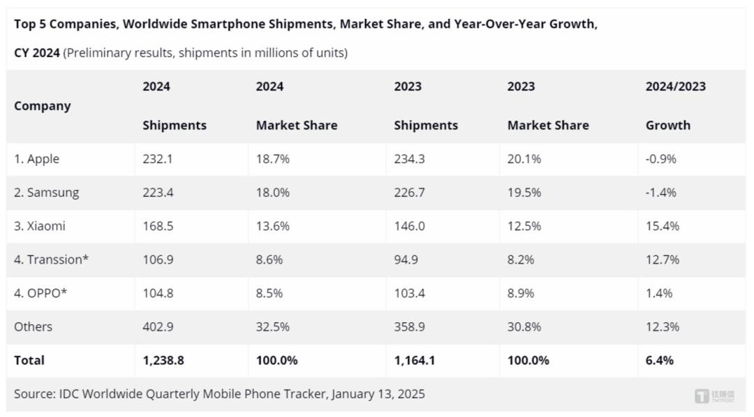 一个好的信号是,研究机构IDC指出,自2023年下半年以来,全球智能手机市场表现稳步回升,去年全年出货量增速接近7%。从销量来看,全球智能手机市场也结束了2023年创下的十年最低点,同比增长4%。