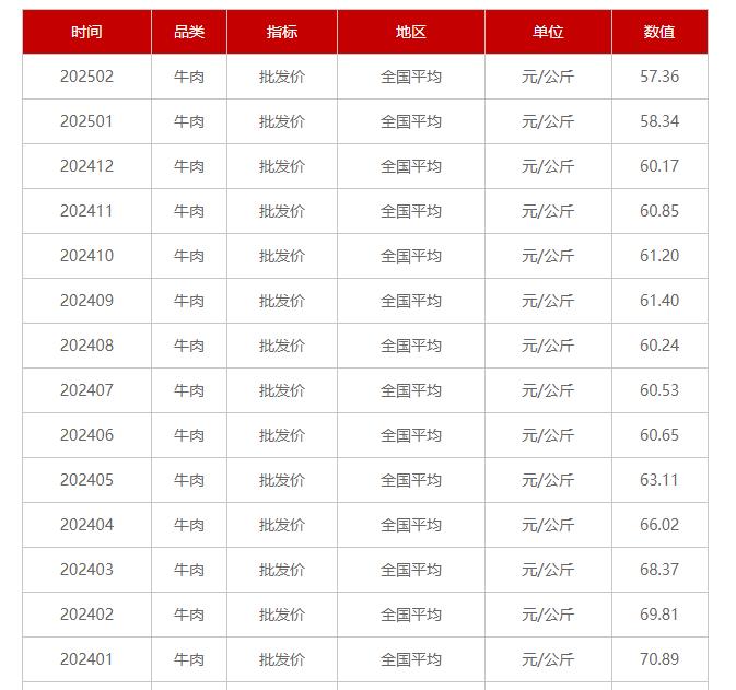 从时间线的延长来看,牛肉的低价运行已经持续了一年多。根据农业和农村事务部的监测,2024年,全国牛肉批发均价一路下跌,年初超过70元/元。KG,年底已徘徊在60元/KG。今年二月,牛肉批发价格进一步下降到57.36元/KG。KG。一年多来,减幅已超过20%。