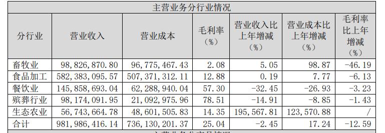 具体而言,2024年,福成股份畜牧业、食品工业、餐饮业、殡葬业的毛利率较2023年有所下降,其中畜牧业毛利率下降最为明显,从2023年的48.27%下降到去年的2.08%。