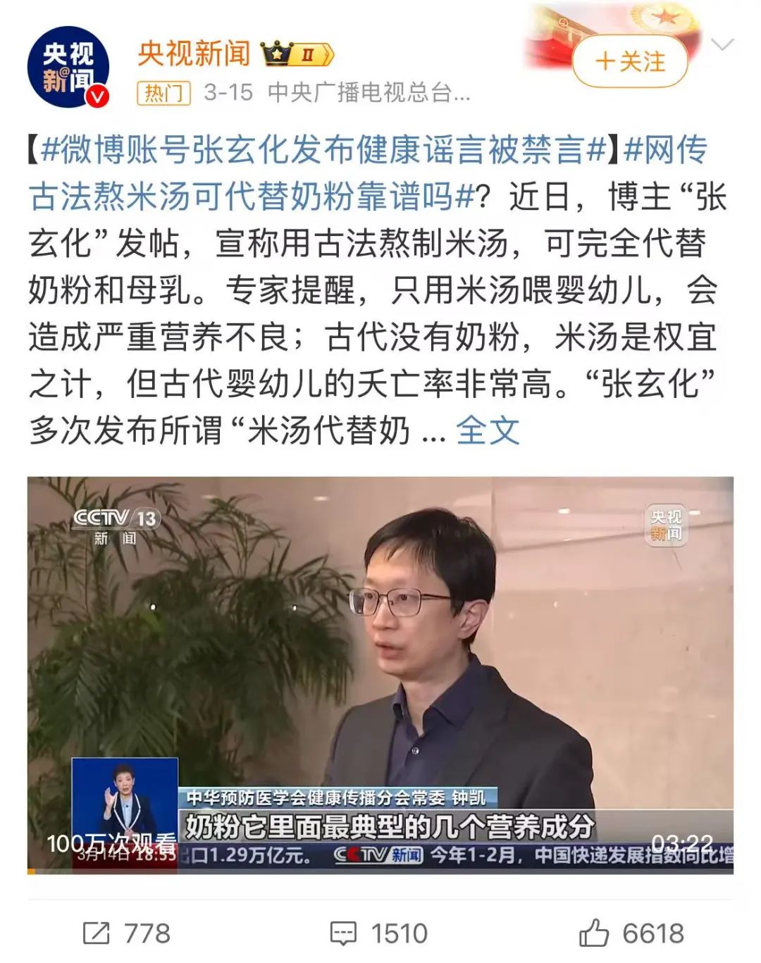 不久前,中国养生博主@张玄化 在作品中,他声称“婴儿配方奶粉可以通过古代米汤完全替代”,甚至建议10个月后停止母乳和米汤喂养,改用莲藕粥,并宣传“喝奶粉会导致孩子大便发臭,容易哭”等类似观点。许多专家指出,由于米汤的蛋白质、脂肪、维生素和矿物质含量远低于配方奶粉,这些言论缺乏科学论证。长时间喂养会导致婴幼儿严重营养不良,甚至可能重复历史上因劣质奶粉而导致的“大头娃娃”不幸。