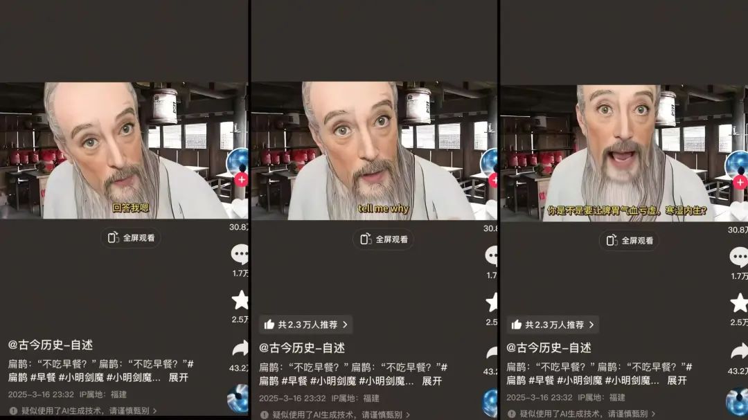 比如@古今历史-自述 在一段与早餐相关的视频中,黄帝时期的神医扁鹊愤怒地向网友传来了一波又一波的灵魂拷问:“如果你早上不吃东西,那我就问你,《内经》说:“如果你的胃不和,你会感到不安,你会失去你的胃。你还想睡个好觉吗?回答我!讲话!你们觉得饿一顿没事,气血晨起如朝阳,你们不给他柴火,怎样才能一身正气?回答我!讲话!look in my eyes!tell me why!要不要让肠胃气血两亏,寒湿内部?之后吃什么都消化不了?回答我!讲话!”