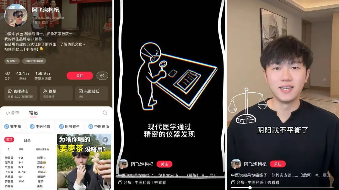 另一位小红书博主@阿飞泡枸杞,有中国中医科学院博士的专业背景。他善于从中医的角度解释日常生活中遇到的各种问题,并提出相应的解决方案,比如很多人每晚3、总是在4点钟醒来,从中医的角度来看,可能是肝经或肺经阻塞,按摩或推拉相应的穴位疏通经络,可以有效地解决问题。另外,针对痛经、湿气重、气血不足、失眠等一系列与身体健康密切相关的问题,几乎都有涉及。