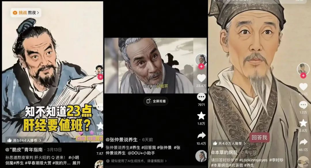 而且近日,多位著名的古代中医集体在抖音“团建”,开展了一系列中医知识科普视频“回答我”:在AI技术的帮助下,李时珍、扁鹊、张仲景、华佗、孙思邈等“祖先”不断“复活”,同时向网友发起愤怒的质疑,同时又恨铁不成钢地开展中医知识科普。