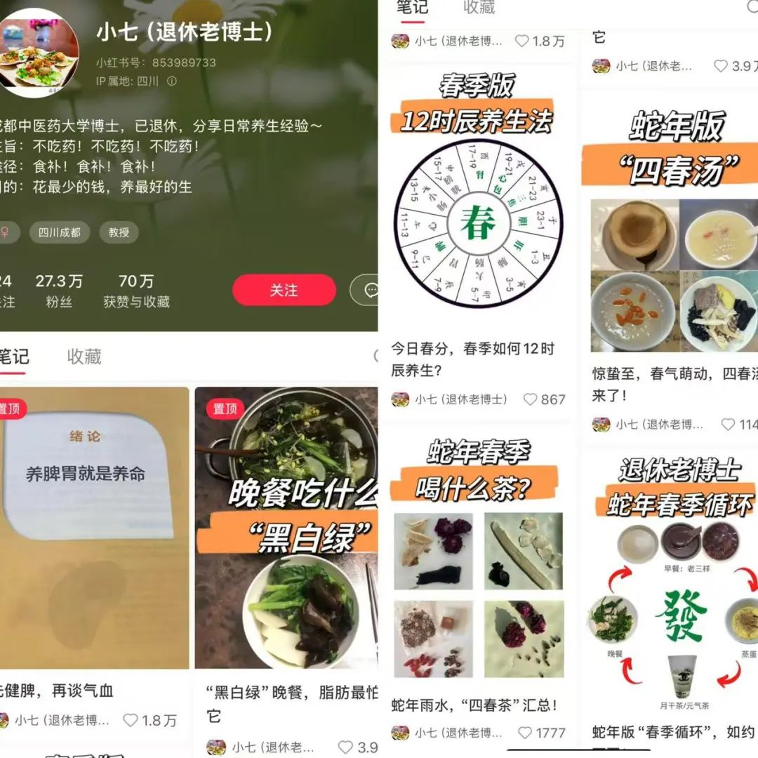 @小七(退休医生),成都中医药大学的退休医生,虽然他的账号也分享了他的日常健康经验,但主要内容是以图文方式分享适合不同季节和节气的健康食品,致力于通过食物补充达到“花最少的钱,养最好的生活”的目的。