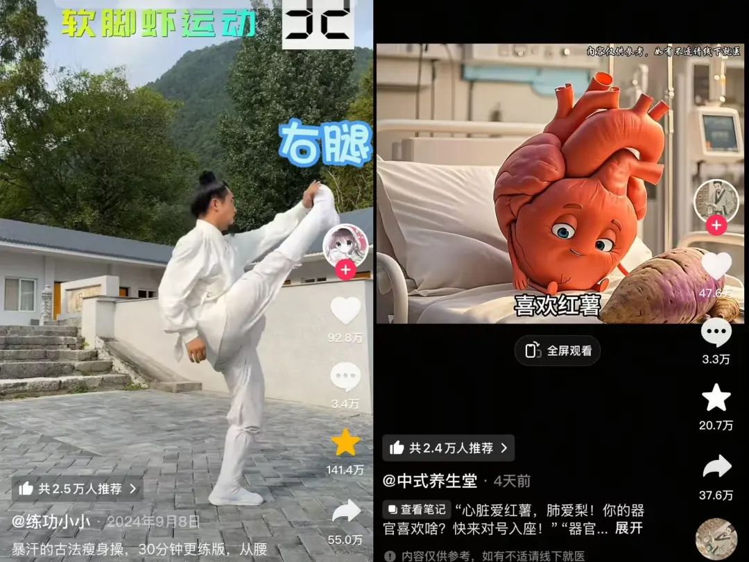 一段发布于去年9月的古方养身操和练习视频在抖音上点赞92.8W、收藏量高达141.41.W;一段中国食品补充视频,由动画演示,“各器官最喜欢的食物”,点赞47.6W、收藏量达20.7W;