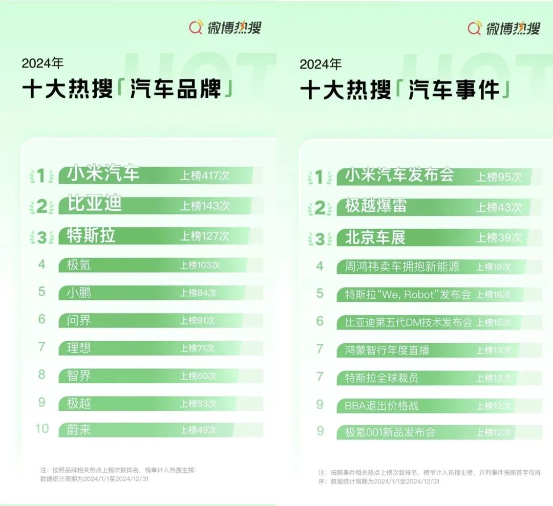 雷军和小米不仅吸引了大量的流量,而且持续了很长时间。在过去的一年里,只有在微博平台上,小米汽车才登上热搜。 417 第二,小米汽车发布会登上热搜。 95 第二,拉开第二名一个数量级。