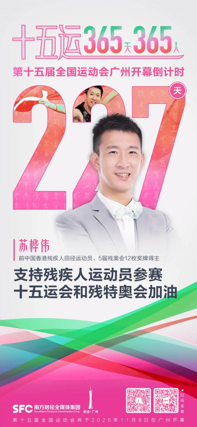 第十五届全国运动会将在 2025 年 11 月份在粤港澳三地举行。它是一项体育赛事,也是促进全民健身、促进体育事业高质量发展的重要机遇。在十五运会开幕倒计时一周年之际,南方财经全媒体集团与十五运会、残特奥会广州赛区执委会推出“十五运会” 365 天 365 “人”栏目聚焦选手、企业家、专家学者、体育爱好者、公众的全运故事和全运期待,让更多人了解和支持十五运,生动展现中国的体育精神、城市活力和文化魅力。