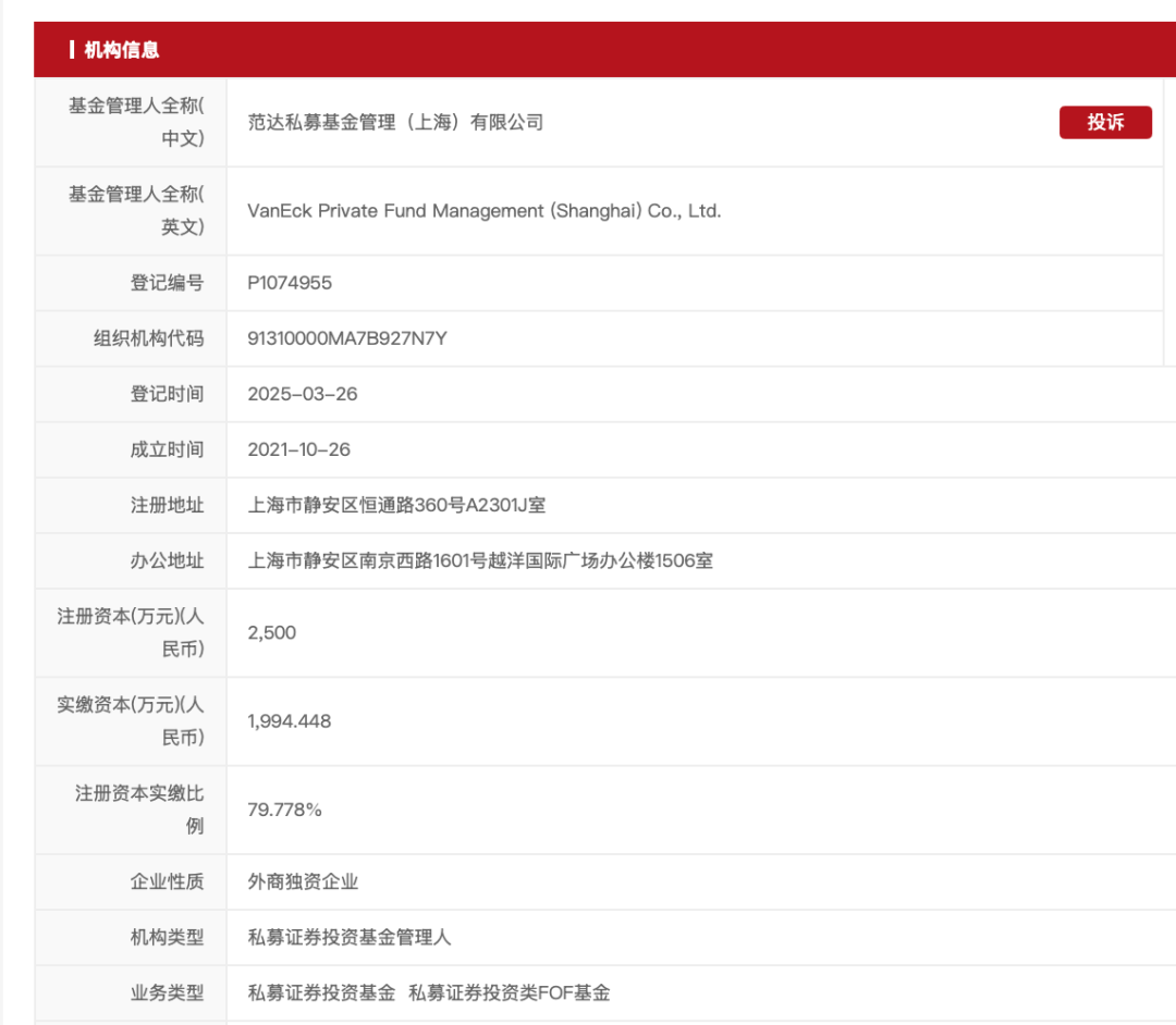 中国证券投资基金行业协会官网显示,范达私募基金管理(上海)有限公司(以下简称范达私募)于2月26日在协会完成私募管理人登记。公司注册资本2500万元,为外资独资企业,范达集团有限公司实际控制人(Van Eck Associates Corporation)(下面简称范达)。
