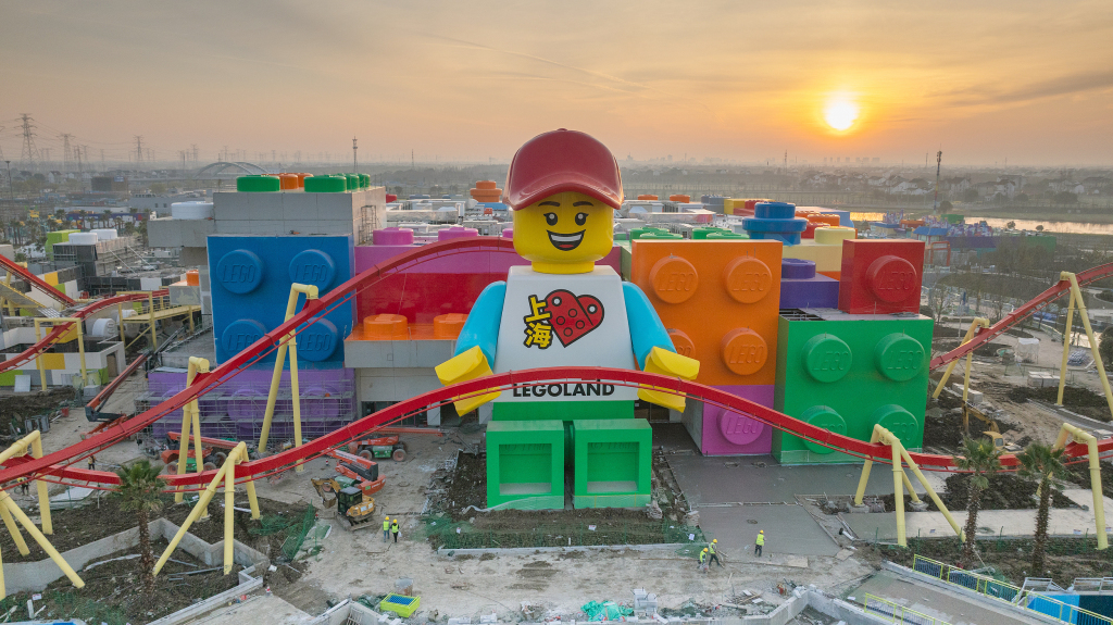 2025年3月17日,世界上最大的巨型乐高娃娃“搭建”出现在上海乐高乐园,高26米,重136吨。视觉中国 图