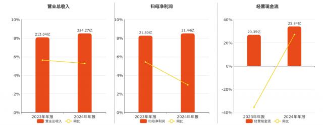企业总营业收入为 224.27 亿元。归母净利润为 22.44 十亿元。经营活动现金净流入 25.84 亿元。