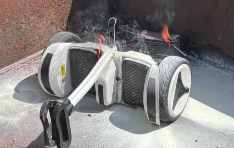消防队员将平衡车的电池线与外部电源连接起来,产生短路,烟雾首先从平衡车的底部冒出,然后出现明火,产生的焦味非常呛人。