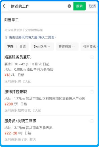 只需在微信上搜索:「附近的工作」、「兼职」、「日结」、「零工」等待任何关键字,搜索结果将呈现零工岗位专区。