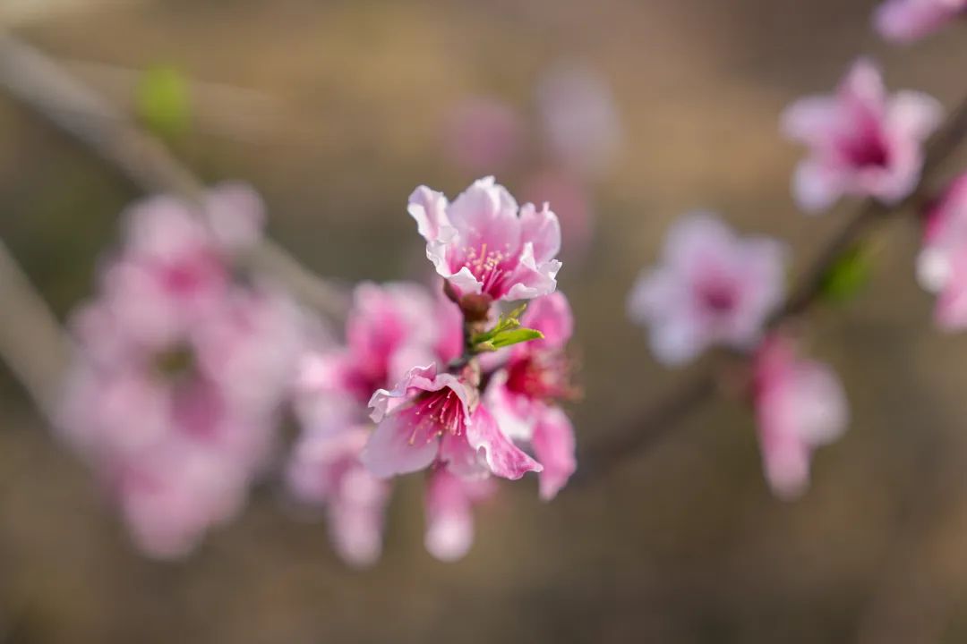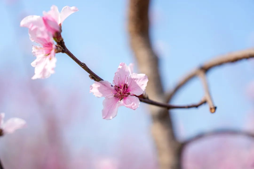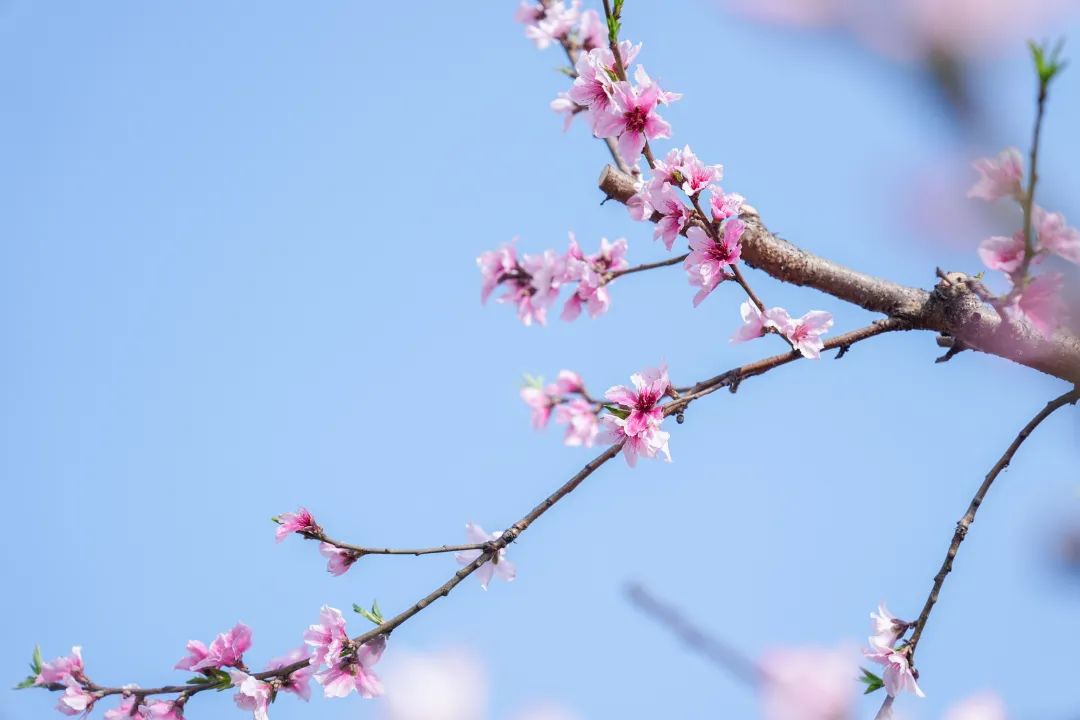 桃林里,粉色和白色的桃花挂满了树枝。它们要么被包围,要么独自在树枝上摇曳,展现出婀娜多姿的姿态。粉色的花朵像女孩的裙子一样摇曳,蜜蜂和蝴蝶翩翩起舞,为这个春天增添了活力。