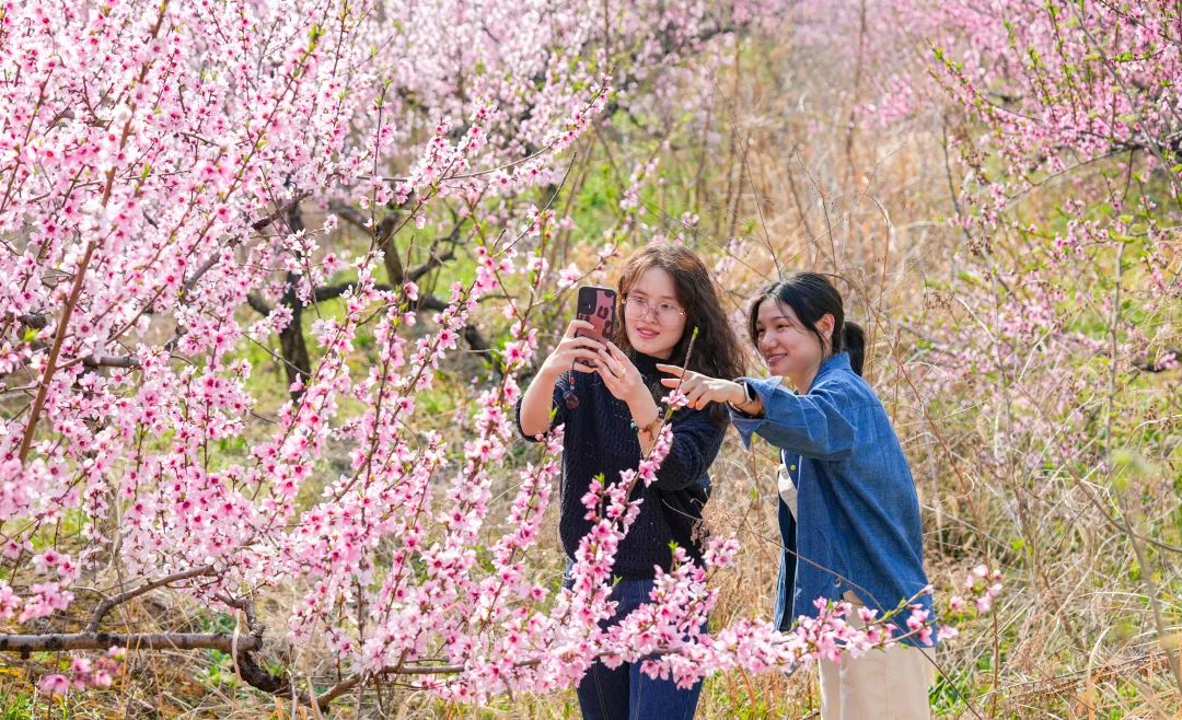美丽的风景吸引着游客走过桃林,欣赏桃花,停下来拍照,沉醉在风景如画的氛围中。“我以前只知道这里有桃子收获。没想到桃花开得这么漂亮。感觉每个地方都是天然的画轴,随便拍一下都好看。” 刘女士来打卡时兴奋地说。