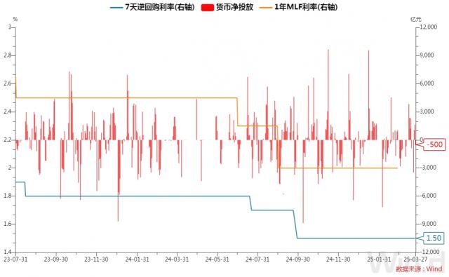 央行 3 月 27 日以固定利率、数量招标方式进行 2185 亿元 7 天期逆回购操作,操作利率 投标量1.50% 2185 亿元,中标量 2185 亿元。Wind 数据显示,当天 2685 逆回购到期1亿元,由此计算,单日净回笼 500 亿元。