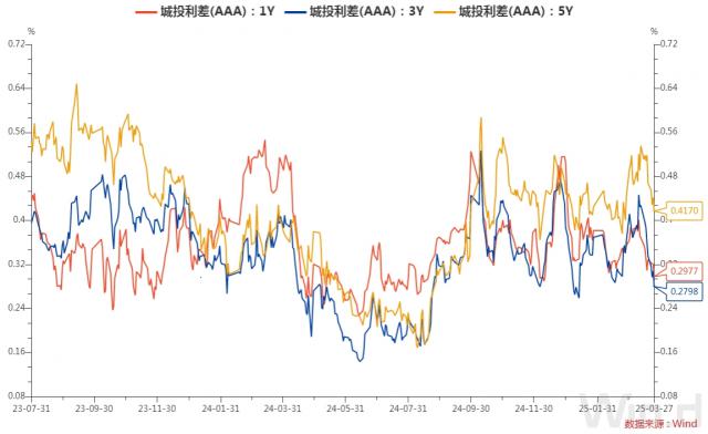5. 最近城投债(AAA)每个期限的利差走势和数据。