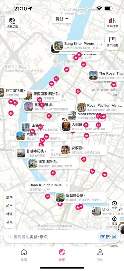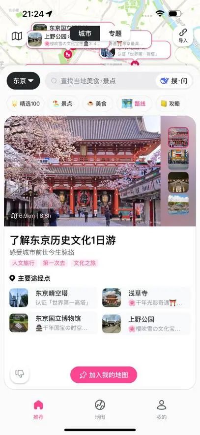 你可以通过地图看到当前城市的热门景点。点击地图中包含景点的照片后,可以看到景点的细节,包括旅游策略、美食推荐、路线导航等。