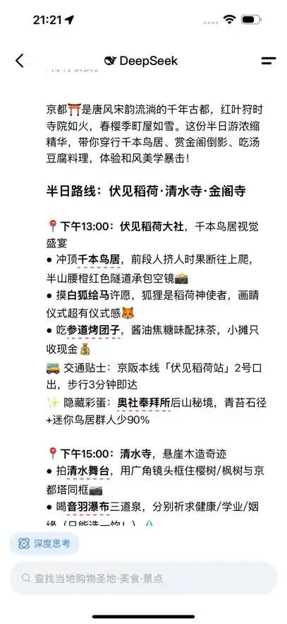 泡泡钉内置了DeepSeek,可以根据用户的时间和兴趣提供智能高效的旅行路线规划。比如当客户只有两天的周末,对历史遗迹感兴趣时,DeepSeek可以快速生成包含当地著名历史遗迹在内的具体路线,这是马蜂窝APP在AI规划深度上暂时无法企及的。