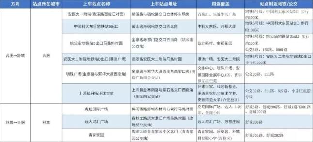 起点为安医科大学第一附属医院(绩溪路百脑汇对面),停靠中国科大东区地铁站D出口、姚公庙地铁站D出口对面(姚公庙公交站)、安医大二附院地铁站D出口(港澳广场)、明珠广场(金寨路西南角繁华大道)、上派镇开辟了九个“便民驿站”,包括环球名门、克拉国际广场、远大港汇广场、青青家园等,无需中转,一站式直通。在这些网站中,从安医大一附院到上派镇开拓环球名门都在合肥境内,另外三个是舒城上车网站。