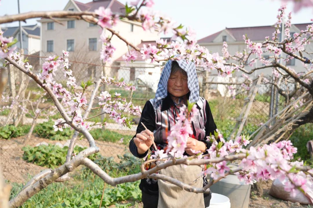 桃林深处,乡亲们也忙着穿梭于桃林中,紧抓农时,为盛开的桃花进行人工授粉,以提高水果的质量和产量。疏花、授粉、除草...毛桥村村民唐志琴手里动作娴熟,用花棒将花粉匀称地放在每一朵桃花的雄蕊上,人工授粉完成。“今年气温高,这两天桃花都开了。我们应该选择那些刚刚盛开的花,花瓣上有一些蓝色的花。基本上,我们应该每天来桃林两三次,以确保今年桃子的产量。”唐志琴说。