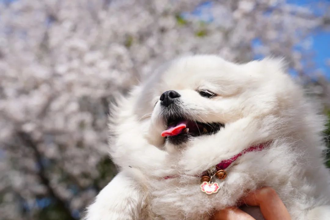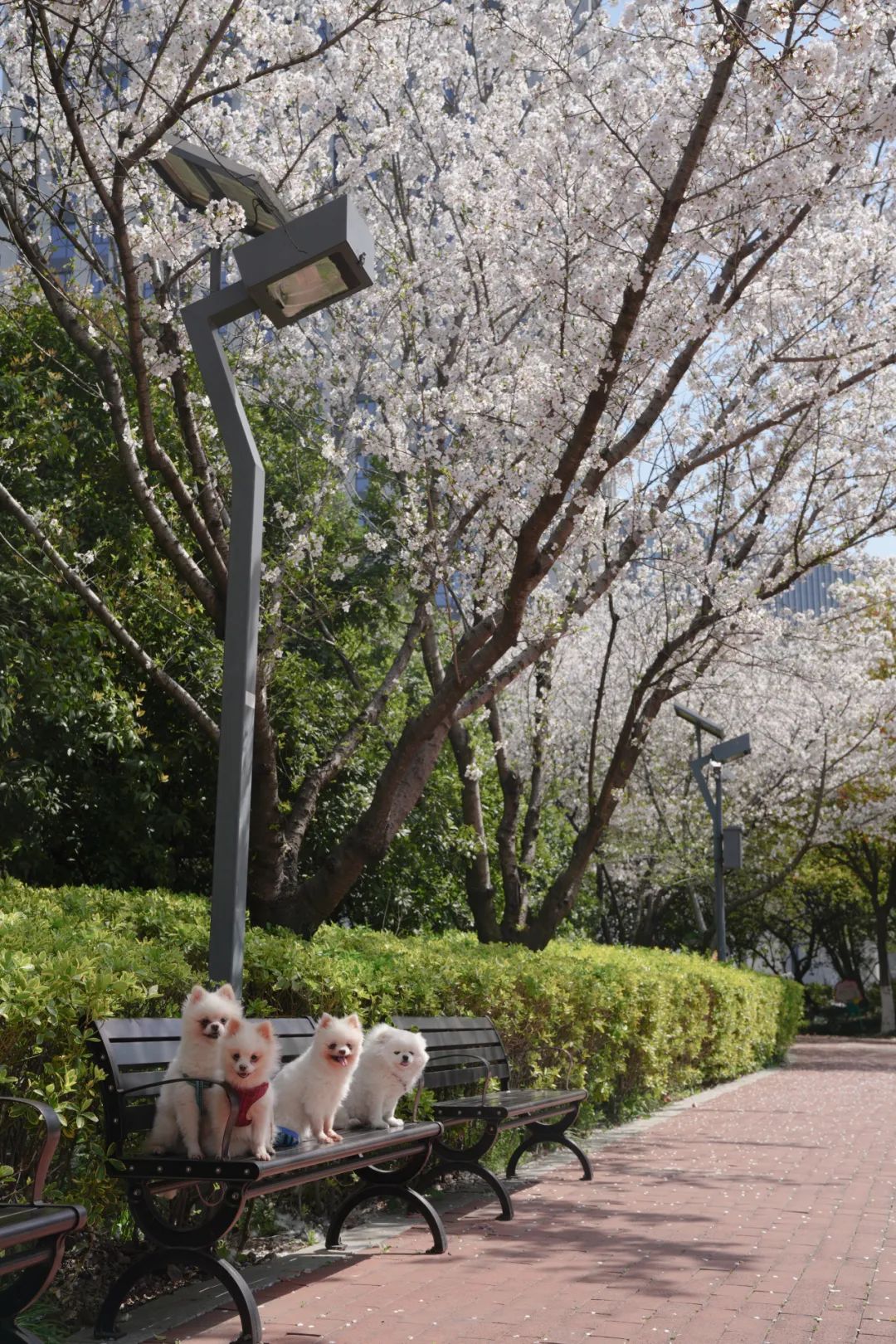 许多小狗乖巧地坐在公园的长椅上,它们似乎也在欣赏着这个春天的美丽景色,享受着温暖的阳光和微风。